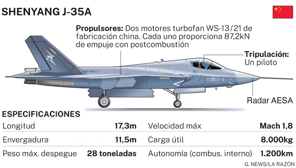 El J-35, derivado del programa FC-31 de Shenyang, fue adaptado para operaciones navales con alas plegables, tren reforzado y barra de catapulta. Los reportes señalan que ya se encuentra en producción en serie, con evidencias de fuselajes en la planta de Shenyang y despliegues vinculados a unidades de la Fuerza Aérea china. El caza, un bimotor furtivo de 17 metros de longitud y hasta 28 toneladas de peso máximo al despegue, puede portar misiles aire-aire de largo alcance PL-15 y municiones de precisión como el LD-8A, con capacidad de operaciones en red y guerra electrónica.
